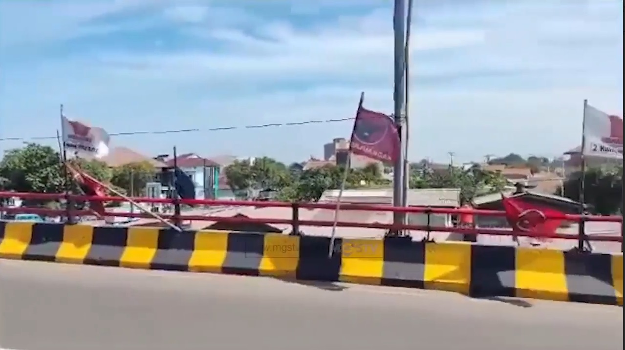 ratusan baliho dan bendera partai yang berjajar di sepanjang pagar pembatas fly over cileungsi, kecamatan cileungsi, kabupaten bogor. ditertibkan petugas panwascam, atau panitia pengawas kecamatan cileungsi, hal ini untuk memberikan rasa aman pada pengguna jalan, juga menjaga kebersihan lingkungan.